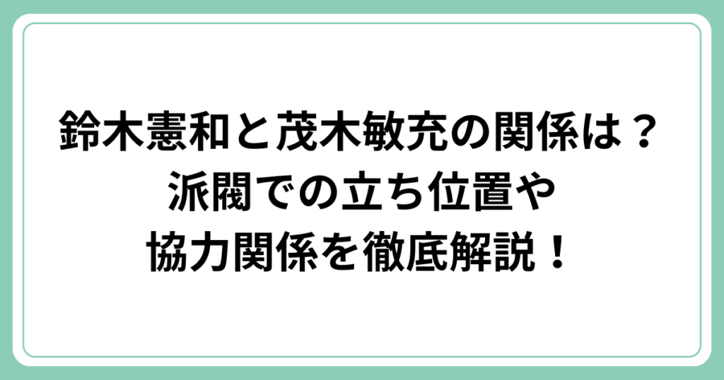 自民党の衆議院議員である鈴木憲和氏と茂木敏充氏の名前を一緒に目にすることが増えていますね。 両氏はどのような関係にあるのでしょうか? この記事では、鈴木憲和氏と茂木敏充氏の関係性について、派閥での立ち位置や協力関係を詳しく解説していきます... -